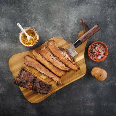 Beef Brisket wird oftmals bei niedrigen Temperaturen zwischen 100 und 130 Grad zubereitet. Wenn das Brisket bis zur Kerntemperatur gegart wurde, wird es quer zur Faser in dünne Scheiben geschnitten und serviert.
